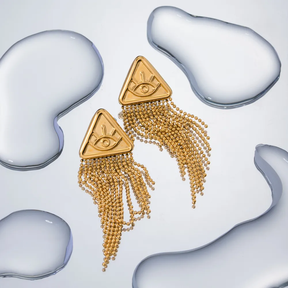 Triangular relief devil’s eye design with tassel titanium steel earrings
